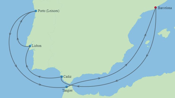 Hajó útvonala II.: Barcelona - tengeren - Cadiz (Sevilla) - Lisszabon (2 nap) - Porto - tengeren - Tangier, Marokkó - tengeren - Barcelona