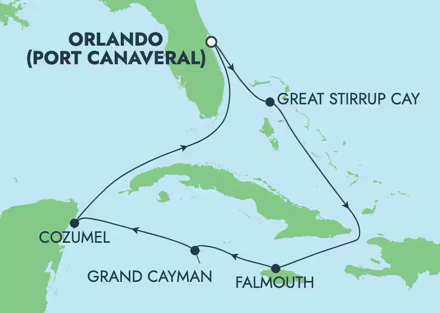 Hajó útvonala: Orlando, Port Canaveral - Great Stirrup Cay, Bahamák - tengeren - Falmouth, Jamaika - George Town, Kajmán-szigetek - Cozumel, Mexikó - tengeren - Orlando, Port Canaveral