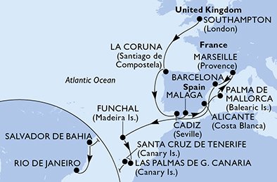 - Southampton -> At Sea -> La Coruna (Santiago de Compostela) Spain -> At Sea -> Cadiz (Seville) Spain -> Malaga (Granada) Spain -> Alicante Spain -> Palma de Mallorca Spain -> Marseille (Provence) France -> Barcelona Spain -> At Sea -> At Sea -> Funchal (Madeira Is.) Portugal -> Las Palmas de G.Canaria (Canary Is.) Spain -> Santa Cruz de Tenerife Spain -> At Sea -> At Sea -> At Sea -> At Sea -> At Sea -> At Sea -> Salvador Brazil -> At Sea -> At Sea -> Rio de Janeiro Brazil