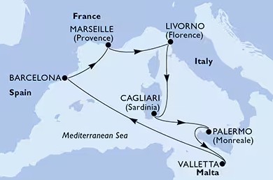 Indulási és Érkezési kikötők: Barcelona, Spanyolország & Genova, Olaszország & Livorno, Olaszország & Nápoly, Olaszország