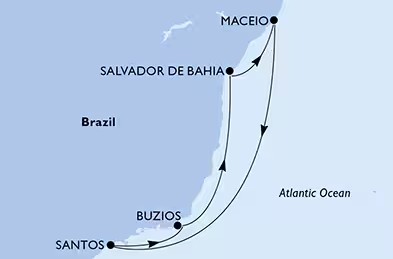 Hajó útvonala: Santos - Buzios - tengeren - Salvador - Maceio - tengeren (2 nap) - Santos